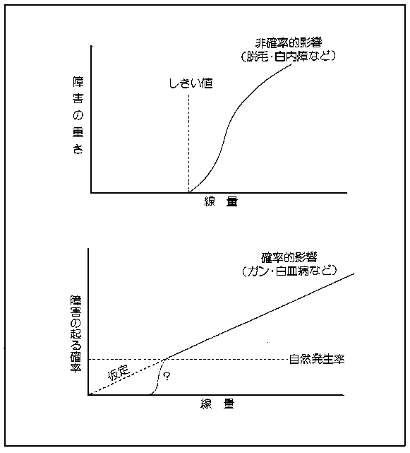 非確率的影響とは、ある線量以下では影響が現れないという「しきい値」があ る影響をいい、確率的影響とは、線量の程度によって、影響の発生確率が変わ る影響をいいます。